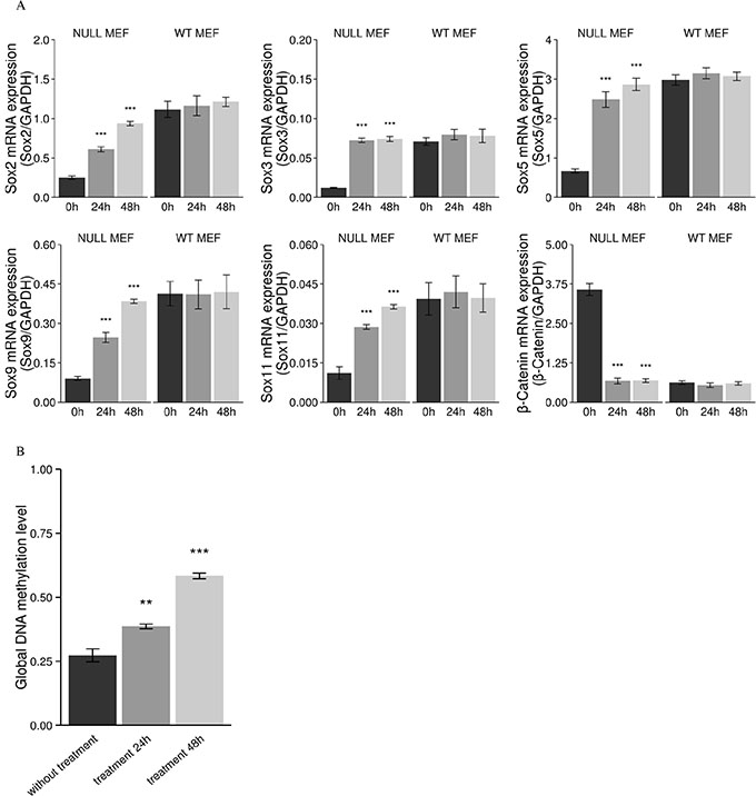 Figure 11: Increased mRNA expression of Sox genes, subsequent decreased mRNA expression of β-catenin, and decreased global DNA methylation after treatment with the demethylating agent 5-aza-2'-deoxycytidine in Men1 null MEF cells. In Men1 null MEF cells, relative mRNA of Sox2, Sox3, Sox5, Sox9, Sox11, and β-catenin was measured after treatment with 1 μM 5-aza-2'-deoxycytidine for 24 h and 48 h, the asterisks indicate that the mRNA expression of Sox genes are significantly increased and the mRNA expression of β-catenin is significantly decreased as compared to controls. However, mRNA expression of Sox and β-catenin were not significantly changed in Men1 WT MEF cells after treatment (A). The global DNA methylation level is significantly decreased in Men1 null MEF cells by selective degradation DNMT1 with the demethylating agent treatment (0, fully methylated; 1, fully unmethylated) (B). (*P < 0.05, **P < 0.01, ***P < 0.001).