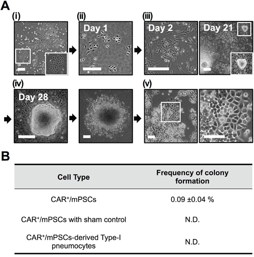 Figure 1: Overexpressing Oct-4 in CAR+/mPSCs. A. Procedure to overexpress Oct-4 in CAR+/mPSCs. (i), Representative phase contrast image of primary culture. The magnified image shows the epithelial colony of mPSCs. (ii), Isolation of mPSCs according to CAR-positive expression of primary cultures using flow cytometry and subsequent transfection with retroviral vectors encoding Oct-4 cDNA. (iii), Transfected CAR+/mPSCs were co-cultivated with feeder cells at day 2. Cobblestone-like colonies were observed at day 21. The magnified image shows the morphology of one colony. (iv), Isolation and expansion of individual cobblestone-like colonies at day 28. (v), Colonies were established as cell clones, comprising C1, E9, and C7 clones. Representative morphology images of the C1 clone. (Scale bar, 100 μm.) B. Frequency of cobblestone-like colony formation. Data are presented as mean ± SD. CAR+/mPSCs with sham control transfection or in CAR+/mPSCs-derived type-I pneumocytes transfected with Oct-4 were no detectable (N.D.) colony formation.