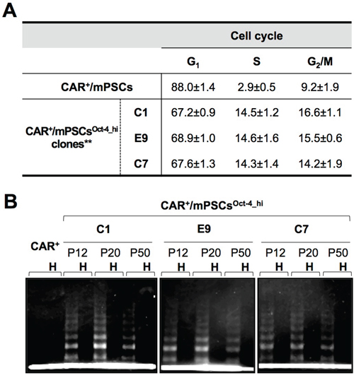 Figure 2: Phenotypic alterations in CAR+/mPSCsOct-4_hi. A. Altered cell cycle distribution. The population for G1-, S-, and G2/M-phases of cell cycle were analyzed of CAR+/mPSCs and CAR+/mPSCsOct-4_hi C1, E9, and C7 clones. Data are presented as mean ± SD. Both the S- and G2/M-phase population of CAR+/mPSCsOct-4_hi clones were strongly increased, ** P < 0.01 compared with CAR+/mPSCs. B. Telomerase activity in CAR+/mPSCs and CAR+/mPSCsOct-4_hi clones. C1, E9, and C7 clones were evaluated in the 12th, 20th, and 50th passages. CAR+ denotes CAR+/mPSCs. H denotes heat inactivation.