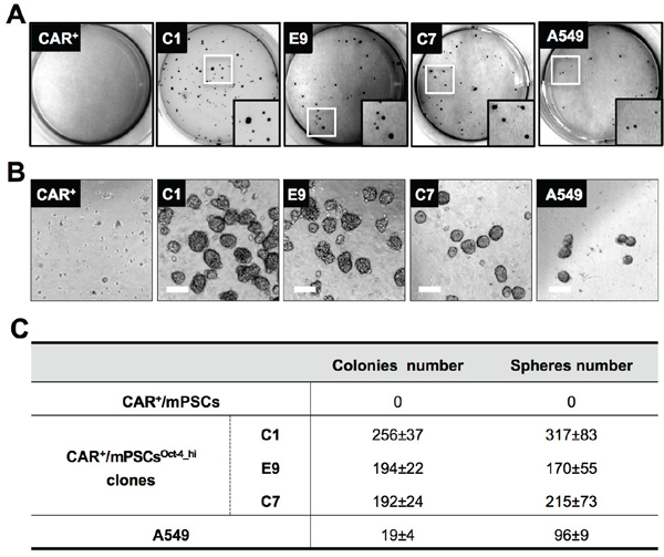 Figure 3: In vitro tumorigenic phenotype of CAR+/mPSCsOct-4_hi. A. The soft agar colony formation assay. CAR+/mPSCs, CAR+/mPSCsOct-4_hi C1, E9, and C7 clones and A549 were subjected to soft agar culture. Colonies were photographed and quantified after 2 wk. B. Sphere formation assay. CAR+/mPSCs, CAR+/mPSCsOct-4_hi C1, E9, and C7 clones and A549 were subjected to a sphere formation assay. Secondary spheres (> 70 μm) were photographed and quantified after 10 d. (Scale bar, 100 μm.) C. Quantification of colonies and spheres. Data are presented as the mean ± SD.