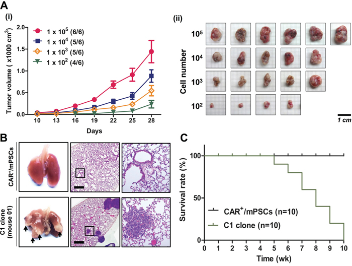 Figure 4: In vivo tumorigenic and metastatic capacities of CAR+/mPSCsOct-4_hi C1 clone. A. In vivo xenograft tumor formation. (i), Growth curve of tumors. Different concentrations of the C1 clone (105, 104, 103, and 102 cells) were subcutaneously injected into SCID mice. Tumor diameters were measured using calipers at the indicated times after injection. Data are presented as mean ± SD. (ii), Tumors were excised, photographed, and measured at day 28 after injection. (Scale bar, 1 cm.) B. Metastatic tumor nodule formation. The C1 clone (3 × 105 cells) was injected into the tail vein of SCID mice. CAR+/mPSCs were injected as a native control. Metastatic tumor nodule formation in the lung was recorded after 5 wk (indicated by arrows). H&E staining of mice injected with the C1 clone showed extensive hemorrhage and nodule formation. The magnified image of C1 clone shows nodules in lung tissue. (Scale bar, 100 μm.) C. Kaplan-Meier survival curves of CAR+/mPSCs- and C1 clone-injected mice (n = 10).