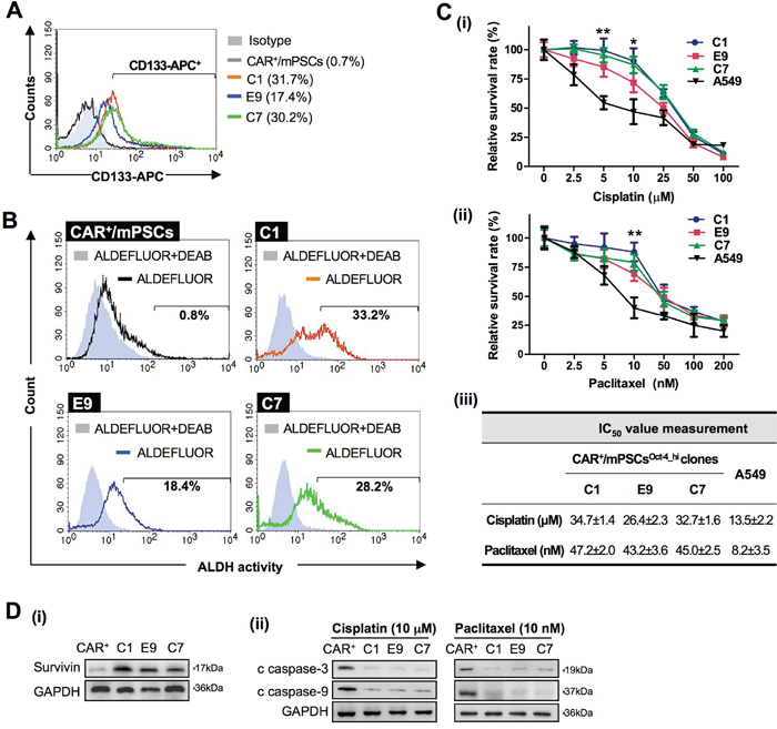 Figure 5: Putative CICs traits in CAR+/mPSCsOct-4_hi. A. Flow cytometry analysis of CD133 expression in CAR+/mPSCs and CAR+/mPSCsOct-4_hi C1, E9, and C7 clones. Percentages indicate the CD133-positive population for each clone. B. Flow cytometry analysis of ALDH activity. The results of the ALDEFLUOR assay with CAR+/mPSCs and CAR+/mPSCsOct-4_hi C1, E9, and C7 clones are shown. DEAB-treated samples served as negative controls. Percentages indicate the ALDH-positive population for each clone. C. Cell viability of CAR+/mPSCsOct-4_hi. CAR+/mPSCsOct-4_hi C1, E9, and C7 clones and A549 cells were treated with (i), cisplatin (2.5, 5, 10, 25, 50, and 100 μM) or (ii), paclitaxel (2.5, 5, 10, 50, 100, and 200 nM) for 48 h. Data are shown as the mean ± SD. * P < 0.05, ** P < 0.01 compared with A549 cells. (iii), IC50 of cisplatin and paclitaxel for CAR+/mPSCsOct-4_hi C1, E9, and C7 clones and A549 cells. Data are shown as the mean ± SD. D. Anti-apoptosis potential of CAR+/mPSCsOct-4_hi clones. (i), Survivin expression in CAR+/mPSCs and CAR+/mPSCsOct-4_hi C1, E9, and C7 clones was analyzed using Western blot. (ii), Cleaved caspase-3 (c caspase-3) and cleaved caspase-9 (c caspase-9) levels in CAR+/mPSCs and CAR+/mPSCsOct-4_hi C1, E9, and C7 clones after 10 μM cisplatin or 10 nM paclitaxel treatment.
