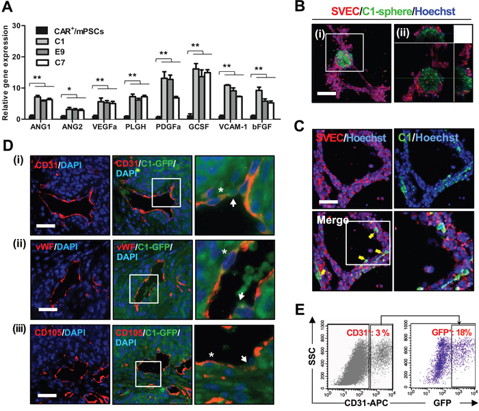 Figure 6: Angiogenesis potential of CAR+/mPSCsOct-4_hi. A. Gene expression levels of proangiogenic factors in CAR+/mPSCs and CAR+/mPSCsOct-4_hi C1, E9, and C7 clones were analyzed using real-time PCR. Data are presented as the mean ± SD. * P < 0.05, ** P < 0.01, compared with CAR+/mPSCs. B. In vitro tube formation assay. SVEC4-10 cells and C1 clone-derived spheres, which stained with PKH26 and calcein-AM, respectively, were co-cultivated on Matrigel. The tube formation was recorded by fluorescence confocal microscopy for 8 h. C1 clone-derived spheres recruited SVEC4-10 cells to generate tube networks. C. A proportion of the C1 clone cells, indicated by arrows, were observed to integrate into the tube network. The magnified image of tube network depicts integration of the C1 clone cells. (Scale bar, 100 μm.) D. Immunofluorescence staining for the expression of endothelial antigens in C1-GFP clone-derived tumors. (i), CD31 was identified. (ii), vWF was identified. (iii) CD105 was identified. The magnified image shows that some GFP+ cells were involved in blood vessel formation (indicated by arrow), and a proportion of GFP+ cells also expressed CD31 (indicated by asterisk). (Scale bar, 100 μm.) E. CD31 expression in dissociated tumors of the C1-GFP clone was analyzed using flow cytometry. CD31+ sub-fraction, representing endothelial cells, constituted 3% of the whole tumor population. GFP expression was found in 18% of the CD31+ endothelial cell sub-fraction.