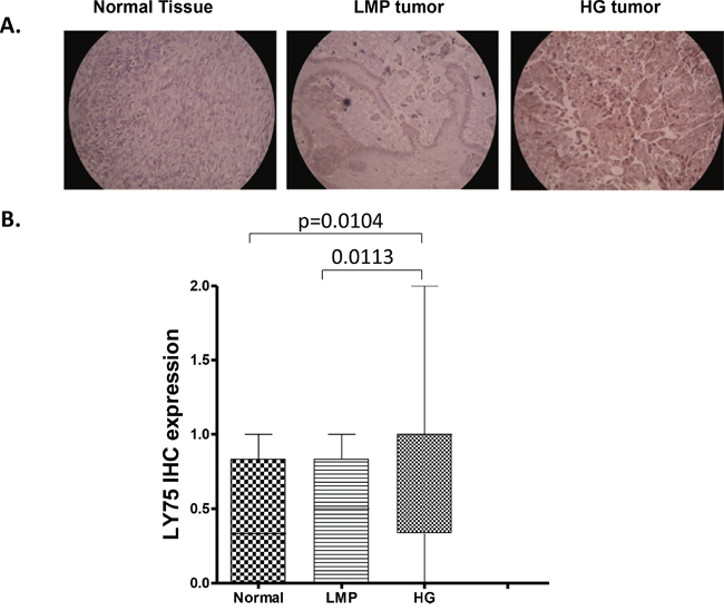 Figure 1: Analysis of LY75 expression in serous EOC tumors by IHC. A. Representative IHC images of LY75 protein expression in normal ovarian tissues, low-malignant potential (LMP) tumors and high-grade (HG) tumors. B. Box-plot presentation of LY75 protein expression levels in normal ovarian tissues, LMP tumors and HG tumors.