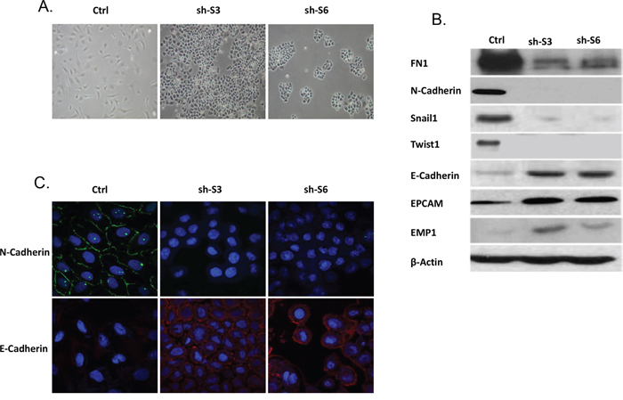 Figure 2: LY75 suppression directs MET in SKOV3 cells. A. Representative phase-contrast images of SKOV3 control and LY75 knockdown clones (sh-S3 and sh-S6). B. Western blot analysis of the expression of different EMT (epithelial and mesenchymal) markers in the control and the LY75 knockdown SKOV3 clones. C. Immunofluorescence staining of E-cadherin and N-cadherin in the control and the LY75 knockdown SKOV3 clones.