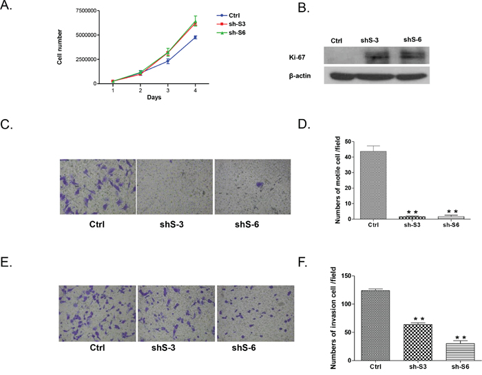 Figure 4: Effect of LY75 knockdown on SKOV3 cell proliferation migration and invasion. A. Cell proliferation of LY75 knockdown clones sh-S3 and sh-S6 was compared to the control clone (Ctrl); B. Western blot analysis of the proliferation marker Ki-67 in LY75 knockdown clones sh-S3 and sh-S6 compared to the control clone. C. Cell migration of LY75 knockdown clones sh-S3 and sh-S6 was compared to the control clone (Ctrl). Migration was assessed using Boyden-chamber assay. Cells from the LY75 knockdown clones sh-S3 and sh-S6 and the Ctrl clone were seeded into the upper chambers in 0.1% FBS containing medium at a density of 2.5 x 104 per well, and 600 μl of 1% FBS containing medium was placed in the lower chamber as a chemoattractant. After 24 h at 37°C in 5% CO2, the cells were fixed with cold methanol and stained with blue trypan solution. Migrated cells on the underside of the filter were photographed and counted by phase contrast microscopy. E. Cell invasion was assayed in a similar way, as the upper chambers were coated with Matrigel. Here, NIH3T3 conditioned medium was added in the lower chamber as a chemoattractant (see Methods for details). All experiments were performed in triplicate. For each experiment, cell number was calculated as the total count from 10 random fields per filter (at magnification × 40). The bar graphs in panels D and F. represent quantitative determinations of migration and invasion data obtained by selecting 10 random fields per filter under phase contrast microscopy and results are expressed as % change of the sh-S3 and sh-S6 clones over the Ctrl clone. Differences between shRNA-LY75 transfected and vehicle- transfected SKOV3 cells were determined by a Student’s t-test; error bars denote mean ± SEM; *indicates statistical significance (p < 0.05).