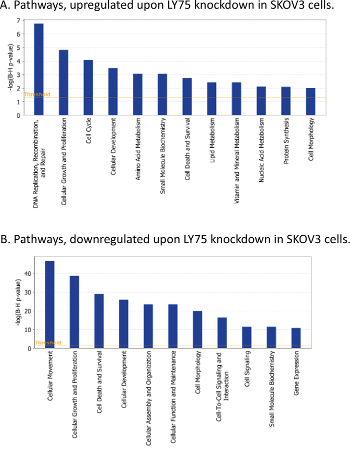 Figure 5: Functional analysis for a dataset of differentially expressed genes (≥ 2-fold) following LY75 suppression in SKOV3 cells. A. Functional analysis of upregulated genes; B. Functional analysis of downregulated genes. Top functions that meet a Bonferroni-Holm multiple testing correction p-value of 0.05 are displayed.