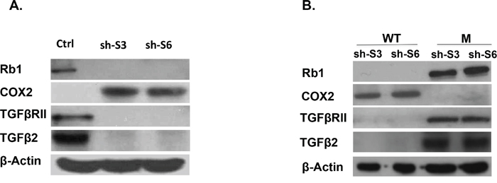 Figure 6: A. Western blot analysis of Rb1, TGFβ2, TGFβRII and COX2 protein expression in LY75 knockdown SKOV3 clones (sh-S3 and sh-S6) compared to the control cells (Ctrl). B. Western blot analysis of Rb1, TGFβ2, TGFβRII and COX2 protein expression in LY75 knockdown clones sh-S3 and sh-S6 upon ectopic expression of the wild-type (WT) or the mutated (M) LY75 gene.