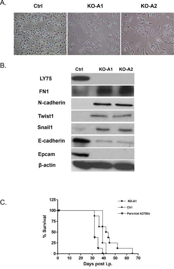 Figure 8: A. Representative phase-contrast images of A2780s control and LY75 knockout clones (KO-A1 and KO-A2). B. Western blot analysis of the expression of different EMT markers in the control and the LY75 knockout A2780s clones. C. Survival curves for mice injected with parental, Ctrl, and LY75 knockout (clone KO-A1) A2780s cells. The median survival of mice injected with the LY75 knockout cells (43 days) was significantly prolonged compared to mice injected with the parental (34 days; p=0.0065, Log rank test) or control cells (37 days; p=0.0153, Log rank test).