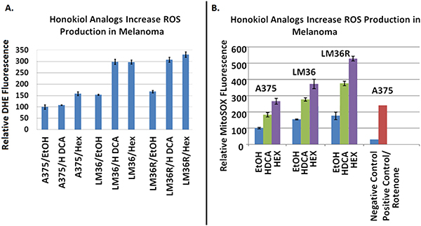 A375, LM36 and LM36R cells were treated with control, honokiol DCA, hexafluoro or vehicle for 24 hours. Cells were washed with PBS, digested with 0.05 % trypsin/0.53 mM EDTA and pelleted at 600g for 5 min. Cells were resuspended in 10 μM dihydroethidium (DHE) and incubated while gently shaking in the dark for 10 min and place on ice in the dark. Analysis of DHE fluorescence was performed on a Becton Dickinson FACScan flow cytometer, 10,000 cells were counted and analyzed by FlowJo 7.6.4. Mean values of the DHE fluorescence intensity were compared. Error bars represent the standard error of the mean of triplicate data points.