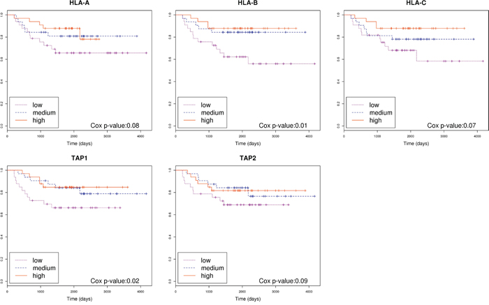 Figure 3: Association of genes related to antigen presentation machinery with prognosis. Kaplan-Meier curves separating patients based on the level of expression of genes HLA-A, HLA-B, HLA-C, TAP1 and TAP2. Cox p-value was calculated for each gene.