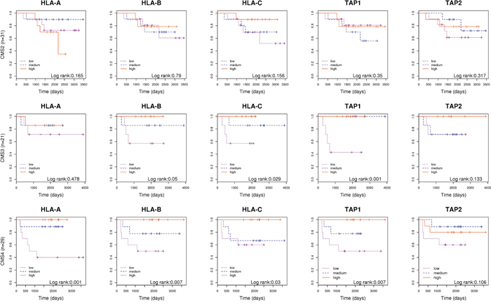 Figure 4: Molecular subtyping. Kaplan-Meier curves separating patients based on the level of expression of genes HLA-A, HLA-B, HLA-C, TAP1 and TAP2; in tumors classified as CMS2, CMS3 and CMS4 separately.