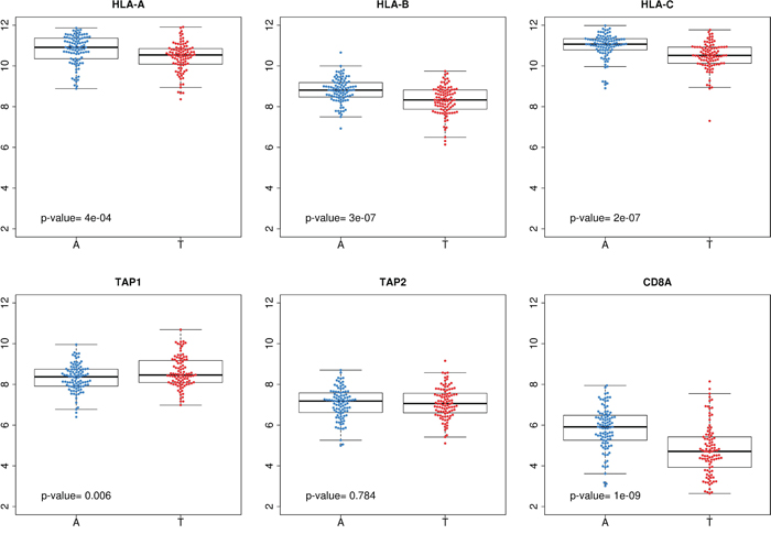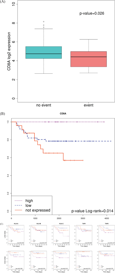 Based on this result, we stratified patients into “high” and “low” groups according to CD8A expression. Then, we looked for the prognosis value of HLAs and TAP genes in each group. As expected, survival curves were significantly different in those patients showing T-cell infiltration (high CD8A levels); whereas no differences were found in those patients without or with low T-cell infiltration (Figure 5C). This result suggested that, in order to be recognized and eliminated by the immune system, T-cells needs to infiltrate the tumor (indicated by high CD8A levels).