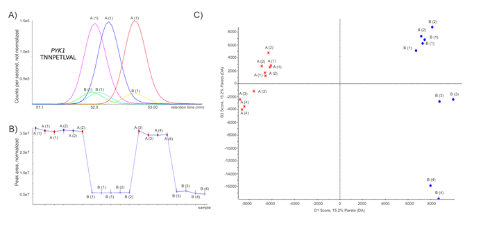 Figure 1: Label-free shotgun proteome profiles of yeast expressing Pyk1p at high and low level. (A)Tryptic digests generated from yeast protein extracts were analyzed on an AB SCIEX QqTOF mass spectrometer. Extracted ion chromatograms for the Pyk1p tryptic peptide K.TNNPETLVAL.R from three LC-MS/MS shotgun runs each of yeast expressing Pyk1p at high level (‚A‘ samples) or low level (‚B‘ samples) .(B)Peak area of all Pyk1p-associated peptides in cells expressing Pyk1p at and high and low level, normalized to the total peak area of the respective run. Replicate injections of the same sample (LC-MS technical replicates) are marked with the same label; Numbers (1) & (2), respectively (3) & (4) indicate sample preparations and tryptic digests from independently grown yeast cultures. (C)Principal component analysis after pareto scaling of the shotgun proteome profiles, generated with MarkerView (AB/Sciex). A change in the Pyk1p expression level clearly separates the proteomes. Determined by two tailed T-test, 31 proteins (Table 1) were significantly (p < 0.05) regulated and responsible for the separation of the proteome profiles.
