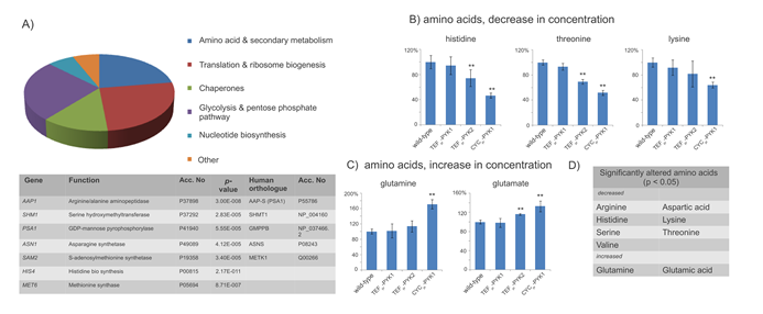 The vast majority of identified PK targets were involved in metabolic processes related to glycolysis, the synthesis of nucleic acids, amino acids and proteins. Although it is assumed that PK mediates the regulation of glycolysis [39, 40], similar mechanisms might also exist for amino acid metabolism. To obtain a metabolic picture of the global PK function in this process we thus set out to use ion exchange chromatography and ninhydrin detection to profile the levels of free amino acids in the PK model strains. Comparing yeast with different PK expression level and activity, we found a clear reconfiguration of the overall amino acid profile. In cells with low PK activity, seven of 17 amino acids were significantly less concentrated, and two were higher concentrated.