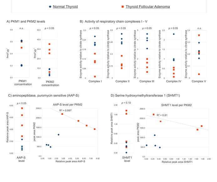 Figure 4: AAP-S and SHMT1 are upregulated in thyroid follicular adenoma and correlate with the PKM2 expression level. (A)PKM2, but not PKM1 concentration, distinguishes thyroid follicular adenoma from normal thyroid. PKM1 and PKM2 were quantified in tumor and the controls [20], the absolute PKM concentrations in individual biopsies are plotted. (B)Activity of the respiratory chain is reduced in thyroid follicular adenoma. Enzyme activity of complexes I – V of the four tumors and control tissues relative to the activity of citrate synthase. (C)Puromycin sensitive aminopeptidase (AAP-S) is upregulated in thyroid follicular adenoma, and correlates with PKM2 in the tumor state. Relative level of AAP-S in tumor and normal thyroid (left panel), AAP-S expression level plotted versus the PKM2 concentration in the same biopsy (right panel). (D)Serine hydroxymethyltransferase 1 (SHMT1) shows clear trends towards higher expression in thyroid follicular adenoma, and seem to correlate with PKM2 in the tumor state. Relative level of SHMT1in tumor and normal thyroid (left panel), SHMT1expression level plotted versus the PKM2 concentration (right panel). (A-D) p- values were determined with two-tailed T test, n.s.: non significant