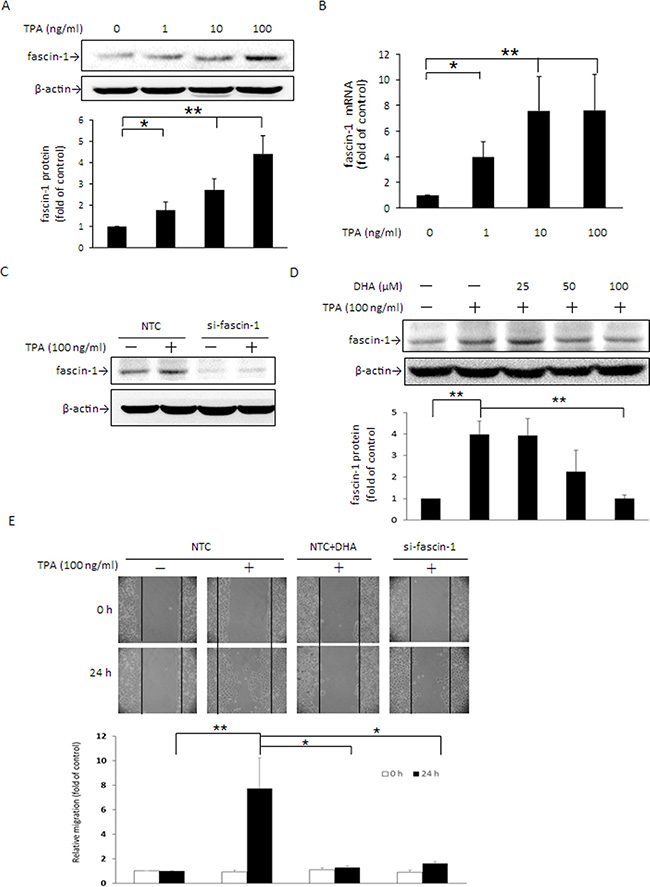 Figure 1: TPA induces fascin-1 expression in MCF-7 cells and fascin-1 siRNA abolishes TPA-induced cell migration. MCF-7 cells were treated with various concentrations of TPA for 24 h. Fascin-1 protein (A) and mRNA (B) levels were determined. (C) Fascin-1 siRNA was used to silence fascin-1 mRNA in MCF-7 cells. After knockdown of fascin-1, the cells were treated with 100 ng/ml TPA for an additional 24 h. (D) Cells were pretreated with 0, 25, 50, or 100 μM DHA for 24 h followed by incubation with 100 ng/ml TPA for another 24 h. (E) After knockdown of fascin-1, the cells were transferred to the IBIDI culture insert and were then treated with or without 100 μM DHA for 24 h before being challenged with 100 ng/ml of TPA for an additional 24 h. Migration was observed by using a phase-contrast microscope at 100× magnification. One representative experiment out of three independent experiments is shown. Values are mean ± SD, n = 3. *p < 0.05 and **p < 0.01.