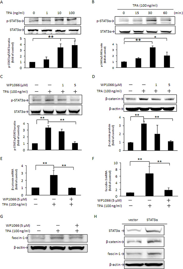Figure 3: TPA increase in STAT3α phosphorylation up-regulates β-catenin and fascin-1 expression. MCF-7 cells were treated with various concentrations of TPA for 30 min (A), were treated with 100 ng/ml of TPA for different time periods (B), or were pretreated with 1 or 5 μM WP1066 for 4 h followed by incubation with 100 ng/ml of TPA for another 30 min (C). STAT3α phosphorylation at Tyr705 was measured. Cells were pretreated with 1 or 5 μM WP1066 for 4 h followed by incubation with 100 ng/ml of TPA for another 24 h. The amounts of cellular β-catenin protein (D) were determined. Changes in β-catenin (E) and fascin-1 mRNA (F) and protein (G) were measured in cells pretreated with or without 5 μM WP1066 for 4 h, followed by incubation with TPA for another 18 h and 24 h, respectively. (H) Cells were transfected with STAT3 expression vector or pcDNA3.1 (−) control vector and were then treated with 100 ng/ml of TPA for an additional 24 h. STAT3α, β-catenin, and fascin-1 proteins were determined. One representative experiment out of three independent experiments is shown. Values are presented as mean ± SD, n = 3. *p < 0.05 and **p < 0.01.