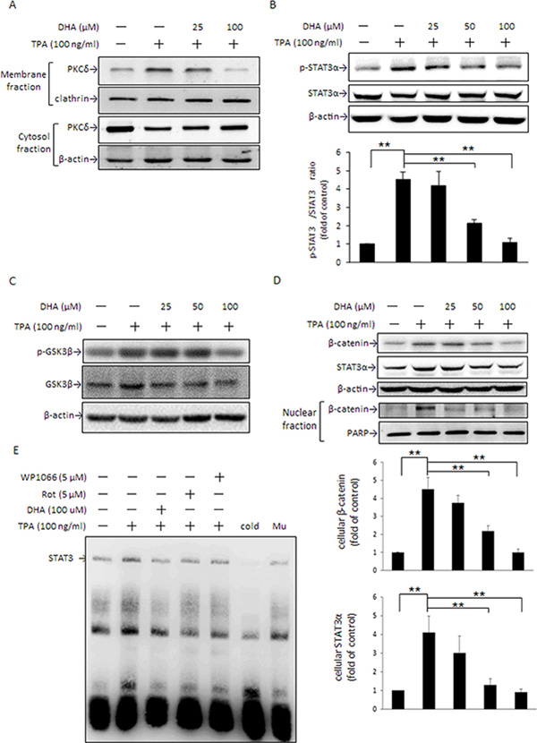 Figure 5: DHA inhibits TPA-induced PKCδ activation, STAT3 DNA binding activity, β-catenin, and STAT3α expression. MCF-7 cells were pretreated with 0, 25, or 100 μM DHA for 24 h followed by incubation with 100 ng/ml of TPA for another 30 min. PKCδ in the plasma membrane and cytosol (A) and STAT3α (B) and GSK3β (C) phosphorylation were determined. (D) Total cellular β-catenin and STAT3α and nuclear β-catenin protein levels were determined in cells pretreated with various concentrations of DHA for 24 h followed by incubation with TPA for another 24 h and 4 h, respectively. (E) Cells were pretreated with 100 μM DHA for 24 h, 5 μM WP for 4 h, or 5 μM rottlerin (Rot) for 1 h, and then were incubated with TPA for another 6 h. Nuclear extracts (10 μg) were prepared for STAT3 nuclear protein DNA binding activity assay. To confirm the specificity of the nucleotide, 50-fold cold probe and mutant (Mu) were included in the EMSA. One representative experiment out of three independent experiments is shown. **p < 0.01.