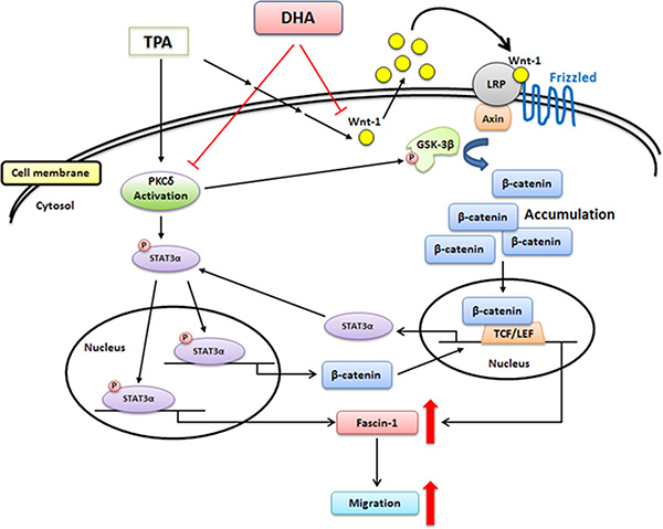 In conclusion, TPA-induced migration of MCF-7 breast cancer cells is associated with the up-regulation of fascin-1 gene transcription, which is mediated through the activation of the PKCδ/STAT3α, PKCδ/GSK3β/β-catenin, and Wnt-1/β-catenin signaling pathways. DHA potently inhibits TPA-induced cell migration by attenuating PKCδ- and Wnt-1-mediated fascin-1 expression (Figure 8). Taken together, our findings provide new insights into the molecular mechanisms of the TPA induction of cell migration and the potency of DHA against metastasis of breast cancer cells.