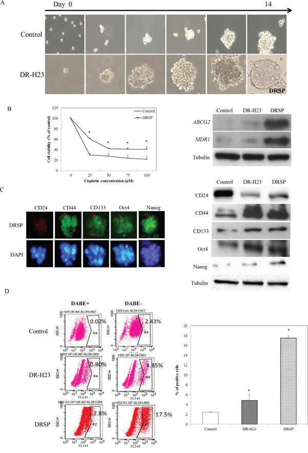 Figure 2: DR cells exhibiting CSC properties. A. Using the nonadhesive sphere culture system, the derivative DR-H23 cells were cultured further for 14 days and generated a spheroid phenotype termed DR spheres (DRSPs). B. MTT assay showed that more surviving cells were significantly found and maintained in DRSPs than those of control cells (p < 0.05). Western blotting showed that the drug resistance-related genes ABCG-2 and MDR-1 were obviously upregulated in DRSPs compared with DR-H23 and control cells. C. Immunofluorescence assay and western blotting showed overexpression of CSC-representative markers, including CD44high/CD24low, CD133, Oct4, and Nanog, in DRSPs compared with DR-H23 and control cells. D. Flow cytometric analysis of ALDH1 showed significantly increased activity in DRSPs compared with DR-H23 and control cells (p < 0.05).