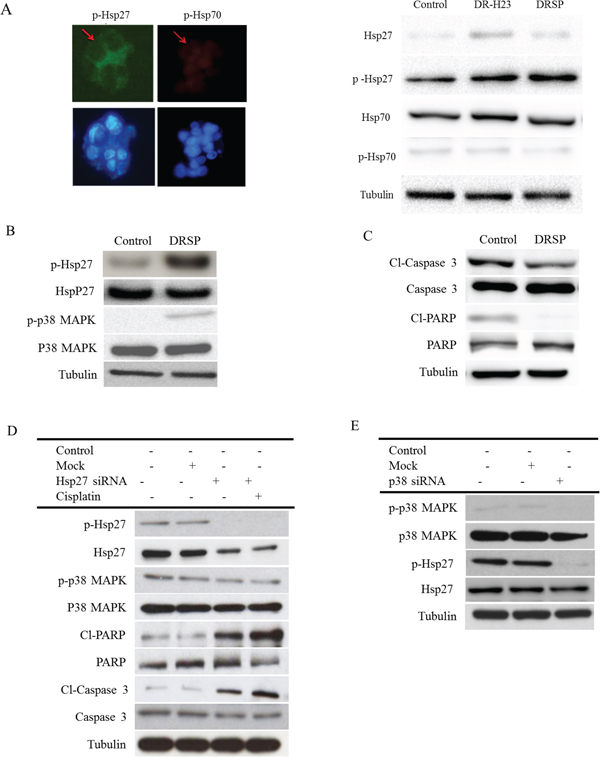 Because of the close relationship between chemoresistance and Hsps, especially Hsp27 and Hsp70, the two most important Hsps, we wondered which of these Hsps might be involved in our model of drug resistance and anti-apoptosis. Immunofluorescence and western blotting assays showed increased expression of p-Hsp27 compared with p-Hsp70. Western blotting showed no obvious differences in the expression of Hsp27 and Hsp70 between DRSPs and control cells (Figure 3A). Because the action of Hsp27 is initiated by p38 MAPK signaling-mediated phosphorylation [32], we measured the levels of p-Hsp27 and p38 in DRSPs. As shown in Figure 3B, the phosphorylation of Hsp27 and p38 was increased in DRSPs compared with control cells. However, expression of the downstream-related apoptotic proteins Cl-caspase 3 and Cl-PARP was markedly decreased in DRSPs (Figure 3C). Short interfering RNA (siRNA)-mediated repression of p-Hsp27 markedly reduced cisplatin resistance in DRSPs. Knockdown of Hsp27 expression induced the apoptosis of DRSPs, as shown by the activation of caspase 3 and PARP. Repression of Hsp27 did not affect the phosphorylation of p38 in DRSPs, which indicated a downstream role of Hsp27 in p38 MAPK signaling (Figure 3D). However, knockdown of p38 in DRSP cells decreased downstream p-Hsp27 expression and increased the resulting number of apoptotic events (Figure 3E). Collectively, the above results suggest that the cisplatin resistance of DRSPs results from the activation of the p38 MAPK–Hsp27 axis.