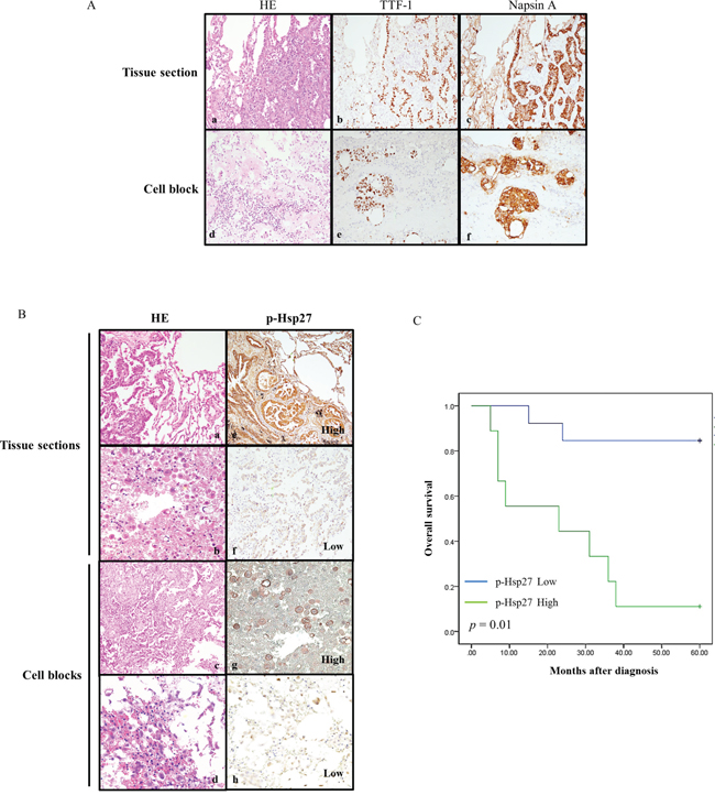 Figure 4: Relationships between p-Hsp27 immunoexpression in tissue sections and cell blocks, and with overall survival. A. Histological and immunohistochemical identification of adenocarcinoma cells in tissue sections (a, b, & c) and cell blocks (d, e, & f) showing positive staining for TTF-1 and Napsin A (magnification, ×200). B. Histological analysis of tissue sections (a & b) and cell blocks (c & d) from four representative patients with pulmonary adenocarcinoma. The corresponding immunoexpression of p-Hsp27 is shown on the right (e, f, g, & h). The samples are from two patients whose tissues exhibited strong intensities with high immunoscores (e & g), and another two patients whose tissues exhibited weak intensities with low immunoscores (f & h) (magnification, ×200). C. Kaplan–Meier survival analysis of the relationship between immunoexpression of p-Hsp27 and survival after a 60-month follow-up. P-Hsp27 expression correlated significantly with overall survival (p = 0.01). Greater p-Hsp27 expression indicated shorter survival in patients with lung cancer.