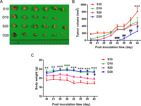 To assess the effect of GPR160 expression on cell proliferation in vivo, PC-3 cells infected with scramble or ShGPR160-D lentiviruses were subcutaneously inoculated into nude mice. Almost all mice developed tumors within 42 days after inoculation, however, the silencing of GPR160 impaired tumor growth. As shown in Figure 3A, when cells infected with ShGPR160 at an multiplicity of infection (MOI) of 20 (D20), the growth of tumors in nude mice was much slower than that of the cells treated with ShGPR160 at an MOI of 10 (D10) and scramble controls (S10 and S20). The average tumor volume of D20 group was 260 ± 223 mm3 on day 42, significantly smaller than that of S20 group (467 ± 71 mm3, P < 0.05), while that of D10 was 525 ± 256 mm3, also significantly smaller than that of the S10 group (810 ± 260 mm3, P < 0.001). The body weight of the mice was less affected in D20 and D10 groups compared to S20 and S10 controls (Figure 3B).