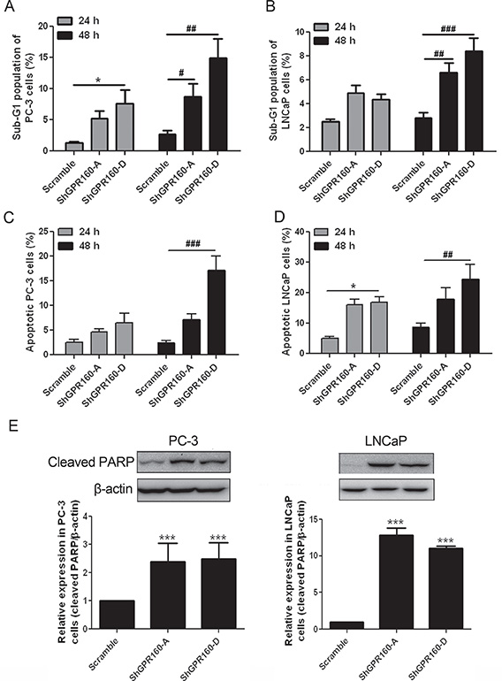 Figure 4: Induction of apoptosis by GPR160 knockdown. (A and B) Sub-G1 peak analysis of PC-3 and LNCaP cells after ShGPR60 infection. Scramble and ShGPR160 lentivirus-infected cells were seeded and incubated for 24 h or 48 h before collection and fixation with ethanol. After PI staining, sub-G1 fraction was analyzed by flow cytometry. (C and D) Detection of APC-Annexin V labeled cells in ShGPR160-infected PC-3 and LNCaP cells. (E) Knockdown of GPR160 induced the cleavage of PARP in PC-3 and LNCaP cells. Data are presented as means ± s.e.m. of at least 3 independent experiments. *,#P < 0.05, ##P < 0.01 and ***,###P < 0.001 compared with scramble control.