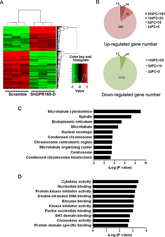 Figure 5: Microarray data for differentially expressed genes (DEGs) between scramble and ShGPR160 infected PC-3 cells. (A) Heat map showing DEGs in ShGPR160 infected cells was generated using normalized log 2-transformed values as shown in pseudo color scale with red indicating activated transcript level and green representing repressed expression of a specific gene. (B) Up- and down-regulated gene numbers annotated. FC is the abbreviation of fold change. Gene Ontology analysis of cellular components (C) and molecular functions (D) were presented for genes modified upon ShGPR160 treatment in PC-3 cells.