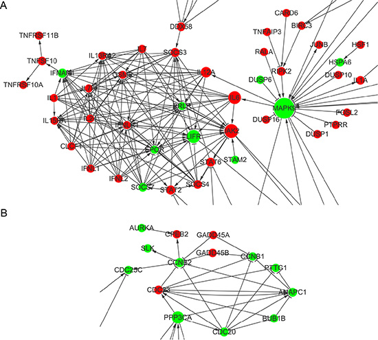 Figure 6: Gene interaction network analysis of differentially expressed genes between scramble and ShGPR160-D treated PC-3 cells. (A) Interactive cytokine and cytokine receptor genes. (B) Interactive genes in the cell cycle biological process. Network maps were generated using Cytoscape with main genes marked as nodes and edges representing relation types between the nodes.