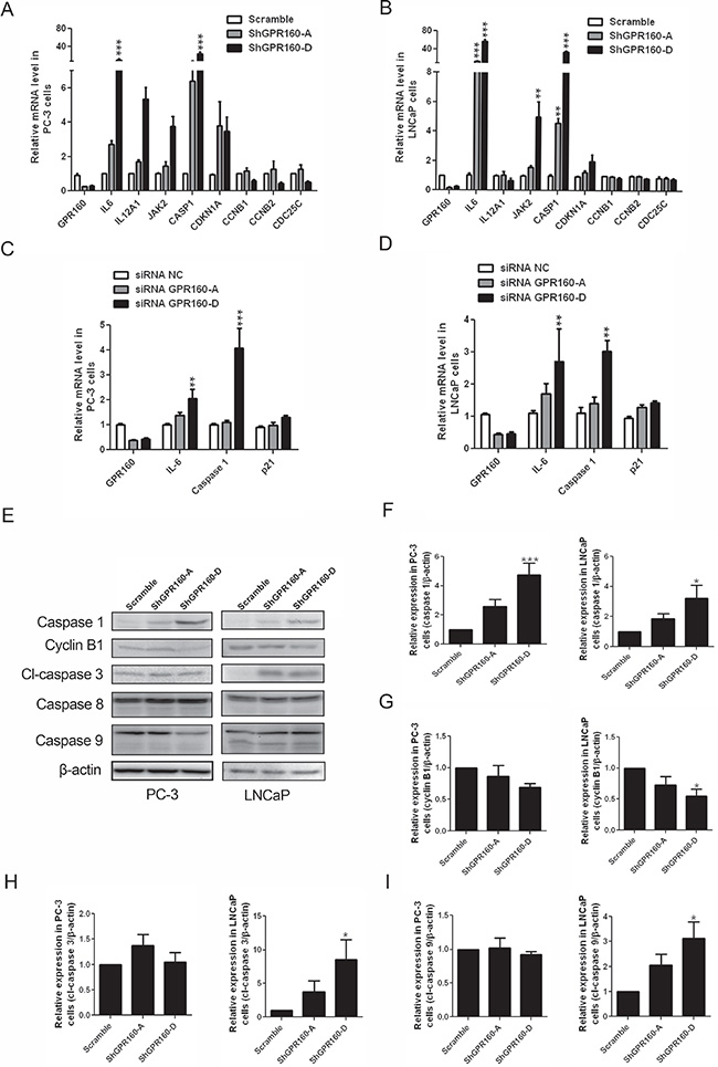 Figure 7: Confirmation of differentially expressed genes between scramble and ShGPR160-D treated PC-3 and LNCaP cells and caspase activation. (A and B) qRT-PCR confirmation of genes involved in the regulation of apoptosis and cell cycle process in ShGPR160-treated prostate cancer cells. (C and D) Effects of GPR160-targeting oligo siRNAs on mRNA levels of DEGs. (E–I) Effects of ShGPR160 treatment on caspase activation and cyclin B1 expression. Cells were collected 5 days after lentivirus transduction and then subjected to Western blot analysis. Bars represent means ± s.e.m. of at least 3 independent experiments. *P < 0.05, **P < 0.01 and ***P < 0.001 compared with scramble virus-infected cells. cl, cleaved.