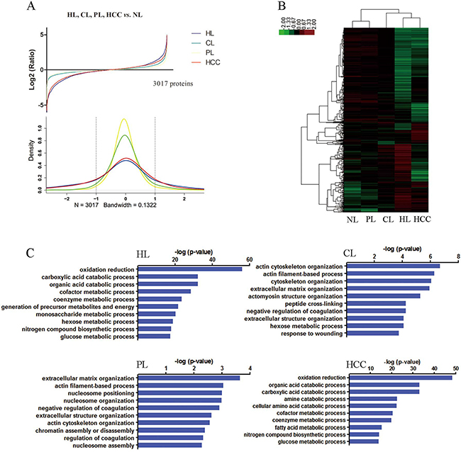 Figure 2: Global protein expression patterns on the spectrum of multistep hepatocarcinogenesis and biological functional annotation. (A) The protein expression distributions (upper) and densities representing the distribution (lower) of all proteins in HL (blue), CL (green), PL (yellow), and HCC (red). The dotted line represents threshold of 2 fold-change. (B) Hierarchical clustering of all identified proteins. HL and PL clustered together. HL and HCC comprised a major sample cluster. (C) Gene ontology function analysis of the differentially expressed proteins in HL, CL, PL and HCC groups compared with NL, the top 10 biological process were presented.