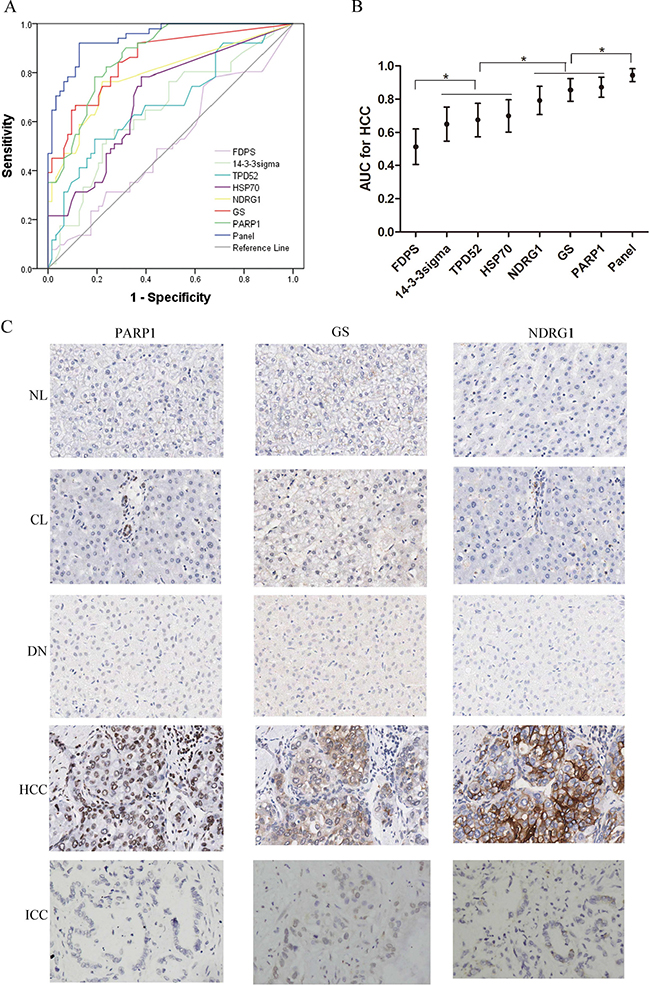 To screen the diagnostic markers of HCC, we focused on the proteins which upregulates in HCCs. The top six highest proteins were 14-3-3sigma, N-myc downstream regulated 1 (NDRG1), tumor protein D52 (TPD52), farnesyl pyrophosphate synthase (FDPS), glutamine synthetase (GS), and poly [ADP-ribose] polymerase 1 (PARP1) (Table 1). To validate whether these proteins are exclusively overexpressed in HCC, we stained them with antibodies in 40 nonmalignant nodules (7 NLs, 19 CLs, 14 DNs), 51 HCCs (24 grade 1–2, and 27 grade 3) and 23 ICCs (Table S4). Notably, heat shock 70 kDa protein (HSP70) ranked No. 11 on the list, and has been repeatedly reported as the diagnostic marker for HCC [2, 14, 15]. Therefore, HSP70 was also stained for reference. ROC curves were constructed to evaluate the area under the curve (AUC) for these potential markers. The AUCs for FDPS, 14-3-3sigma, TPD52, HSP70, NDRG1, GS, and PARP1 were 0.513, 0.650, 0.674, 0.699, 0.792, 0.856, and 0.872, respectively, and all the AUCs were significant compared with Reference Line except that for FDPS. The PARP1, GS, and NDRG1 showed optimal diagnostic performance, whose AUCs were significantly higher than that for 14-3-3sigma, TPD52, and HSP70. (Figure 3A, 3B).