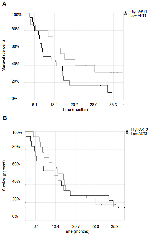 Figure 1: Expression of AKT1 but not of AKT3 negatively correlates with MPM patients’ survival. A. Kaplan-Meier survival curves of malignant pleural mesothelioma patients stratified for AKT1 and B. AKT3 high or low expression levels.