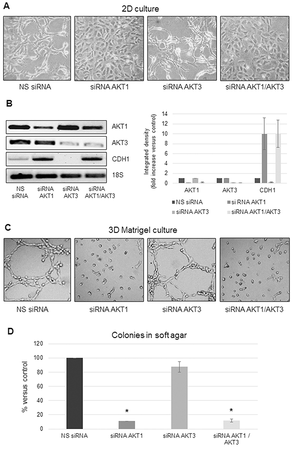 Figure 2: AKT1 silencing affects MPM cell morphology and anchorage-independent growth. A. Phase contrast images (200X magnification) of MSTO-211H cells transfected with non-specific control siRNA (NS siRNA) or AKT1 siRNA (siRNA AKT1), AKT3 siRNA (siRNA AKT3) or both specific siRNAs (siRNA AKT1/AKT3). B. Representative RT-PCR analyses and relative densitometry of AKT1, AKT3, and CDH1 in AKT1 and AKT3 silenced MSTO-211H cells compared to their controls. 18S rRNA was used as housekeeping gene. C. Phase contrast images (200X magnification) of MSTO-211H cells transfected with non-specific control siRNA or AKT isoform specific siRNAs grown on Matrigel coated dishes for 24 hours. D. Soft agar colony counts in non-specific control siRNA or AKT isoform specific siRNAs transfected MSTO-211H cells. Columns represent the percentage of the mean number of colonies versus control ± s.d.; * p≤0.05.