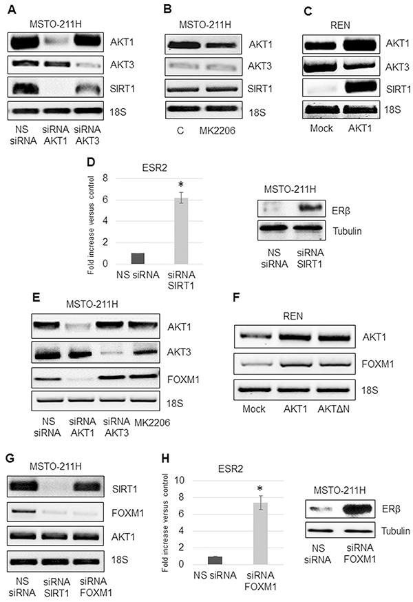 Figure 5: AKT1/SIRT1/FOXM1 axis modulates ERβ expression. A. Representative RT-PCR analyses of AKT1, AKT3 and SIRT1 in MSTO-211H cells transfected with non-specific control siRNA (NS siRNA), and siRNAs of AKT1 (siRNA AKT1) or AKT3 (siRNA AKT3). B. MSTO-211H cells treated for 24 hours ± 8 nM MK2206. C. Mock or AKT1-HA transfected REN cells. 18S rRNA was used as housekeeping gene. D. Real time and representative Western blot analyses of ERβ expression in MSTO-211H cells transfected with non-specific control siRNA (NS siRNA) or SIRT1 siRNA (siRNA SIRT1). Tubulin was used as loading control. E. Representative RT-PCR analyses of AKT1, AKT3 and FOXM1 in MSTO-211H cells transfected with non-specific control siRNA (NS siRNA), and siRNAs of AKT1 (siRNA AKT1) or AKT3 (siRNA AKT3) or treated for 24 hours ± 8 nM MK2206. F. Representative RT-PCR analyses of AKT1 and FOXM1 in Mock, AKT1-HA and AKTΔN transfected REN cells. 18S rRNA was used as housekeeping gene. G. Representative RT-PCR analyses of SIRT1, FOXM1 and AKT1 in MSTO-211H cells transfected with non-specific control siRNA (NS siRNA) or SIRT1 siRNA (siRNA SIRT1) or FOXM1 siRNA (siRNA FOXM1). 18S rRNA was used as housekeeping gene. H. Real time and representative Western blot analyses of ERβ expression in MSTO-211H cells transfected with non-specific control siRNA (NS siRNA) or FOXM1 siRNA (siRNA FOXM1). Tubulin was used as loading control.