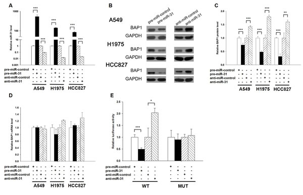 Figure 3: BAP1 is a direct target of miR-31. A. Quantitative RT-PCR analysis of the expression levels of miR-31 in A549, H1975 and HCC827 cells transfected with equal doses of the miR-31 mimic (pre-miR-31), miR-31 inhibitor (anti-miR-31) or scrambled negative control RNA (pre-miR-control or anti-miR-control). B. and C. Western blotting analysis to detect BAP1 protein levels in A549, H1975 and HCC827 cells transfected with equal doses of the miR-31 mimic, miR-31 inhibitor or scrambled negative control RNA. B: representative image; C. quantitative analysis. D. Quantitative RT-PCR analysis of BAP1 mRNA levels in A549, H1975 and HCC827 cells transfected with equal doses of the miR-31 mimic, miR-31 inhibitor or scrambled negative control RNA. E. Direct recognition of the BAP1 3’-UTR by miR-31. Firefly luciferase reporters containing either wild-type (WT) or mutant (MUT) miR-31 binding sites in the BAP1 3’-UTR were co-transfected into A549 cells with equal doses of the miR-31 mimic, miR-31 inhibitor or scrambled negative control RNA. Twenty-four hours post-transfection, the cells were assayed using a luciferase assay kit. Firefly luciferase values were normalized to β-galactosidase activity, and the results were calculated as the ratio of firefly luciferase activity in the miR-31-transfected cells normalized to the negative control RNA-transfected cells. The results are presented as the mean ± S.D. of three independent experiments. (* p < 0.05; ** p < 0.01; *** p < 0.005).