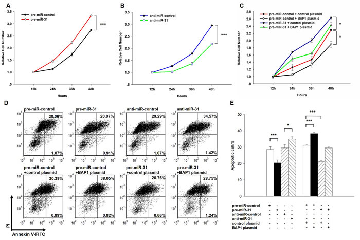 Figure 4: Effect of miR-31 and BAP1 on the proliferation and apoptosis of lung cancer cells. A. A cell proliferation assay was performed 12, 24, 36 and 48 hours after the transfection of A549 cells with equal doses of the miR-31 mimic or scrambled negative control RNA. B. The cell proliferation assay was performed 12, 24, 36 and 48 hours after the transfection of A549 cells with equal doses of the miR-31 inhibitor or scrambled negative control RNA. C. The cell proliferation assay was performed 12, 24, 36 and 48 hours after the transfection of A549 cells with equal doses of the pre-miR-control plus control plasmid, pre-miR-control plus BAP1 overexpression plasmid, miR-31 mimic plus control plasmid, or miR-31 mimic plus BAP1 overexpression plasmid. D. and E. The apoptosis assay was performed 24 hours after the transfection of A549 cells with equal doses of the miR-31 mimic, miR-31 inhibitor or scrambled negative control RNA or with equal doses of the pre-miR-control plus control plasmid, pre-miR-control plus BAP1 overexpression plasmid, miR-31 mimic plus control plasmid, or miR-31 mimic plus BAP1 overexpression plasmid. D. representative image; E. quantitative analysis. The results of cell proliferation are presented as the mean ± S.E. of three independent experience, and other results are presented as the mean ± S.D. of three independent experiments. (* p < 0.05; *** p < 0.005).