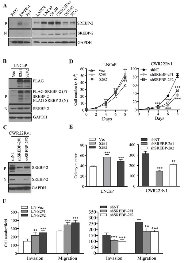 Figure 2: SREBP-2 promotes PCa cell proliferation, invasion and migration. A. Western blot analysis of endogenous SREBP-2 expression in non-cancerous prostate cells (PrEC, RWPE-1 and P69) and PCa cells (LAPC4, LNCaP, C4-2B, CWR22Rv1, DU145 and PC-3). P, precursor form of SREBP-2; N, nuclear form of SREBP-2. B. Western blot analysis of SREBP-2 or FLAG expression level in LNCaP cells stably transfected with control (LN-Vec) or SREBP-2 vectors, LN-S2#1 (clone 1) and LN-S2#2 (clone 2). C. Western blot analysis of SREBP-2 expression in CWR22Rv1 cells stably transduced with non-target (shNT) or SREBP-2 shRNA lentiviral particles, shSREBP-2#1 (clone 1) and shSREBP-2#2 (clone 2). D. growth curves of LNCaP (control and SREBP-2-overexpression) or CWR22Rv1 (shNT and SREBP-2-knockdown) cells with genetically manipulated SREBP-2. Data were shown as the mean ± SD of three independent experiments. *P < 0.05, **P < 0.01, ***P < 0.001. E. colony formation of LNCaP or CWR22Rv1 cells with genetically manipulated SREBP-2. Data were shown as the mean ± SD of three independent experiments. **P < 0.01, ***P < 0.001. F. invasion and migration of SREBP-2-overexpressing LNCaP or SREBP-2-knockdown CWR22Rv1 and their respective control cells. Data represent the mean ± SD of three separate experiments. **P < 0.01, ***P < 0.001.