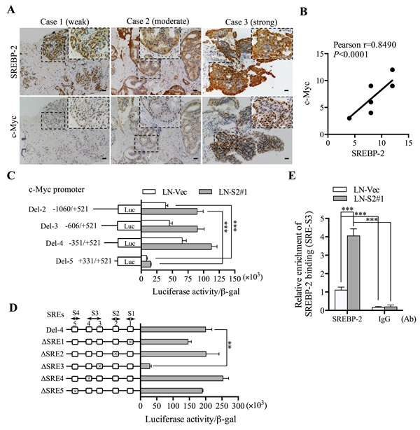 Figure 4: SREBP-2 is positively correlated with c-Myc expression in clinical PCa specimens and directly interacts with a SREBP-2-binding element in the 5’-flanking c-Myc promoter region. A. IHC analysis was used for SREBP-2 and c-Myc expression in human PCa specimens. Representative images with weak, moderate or strong SREBP-2 and c-Myc expression were shown. The enlarged areas of metastatic tumor were indicated in the dashed rectangle. Scale bar = 20 μm. B. the correlation of SREBP-2 and c-Myc expression was analyzed using the Pearson’s R correlation test. C. luciferase activity analysis of c-Myc promoter reporter constructs in LN-Vec and LN-S2#1 cells. ***P < 0.001. D. luciferase activity analysis of five putative SREBP binding site (SRE) deletion constructs and Del-4 c-Myc promoter construct in LN-S2#1 cells. Relative promoter activities were shown as the mean ± SD of three independent experiments. **P < 0.01. E. ChIP analysis of LN-Vec and LN-S2#1 cells immunoprecipitated by anti-SREBP-2 or IgG antibody (Ab) followed by qPCR analysis using a set of primers for SREBP-binding site, SRE-S3 in the c-Myc promoter. Data represent the mean ± SD of three independent experiments. ***P < 0.001.