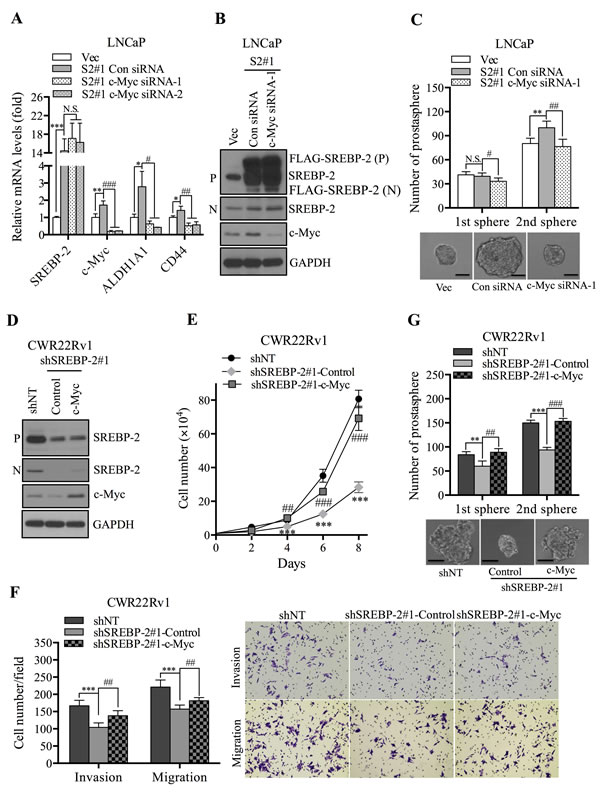Figure 5: SREBP-2 induces stem-cell like properties through activation of c-Myc in PCa cells. A. expression of SREBP-2, c-Myc, ALDH1A1 and CD44 mRNA in LN-Vec and LN-S2#1 cells transfected with control or c-Myc siRNAs (siRNA-1 and siRNA-2) was determined by qPCR. N.S., no significance; *P < 0.05, **P < 0.01, ***P < 0.001, compared with LN-Vec cells; #P < 0.05, ##P < 0.01, ###P < 0.001, compared with LN-S2#1 cells transfected with control siRNA. B. Western blot analysis of SREBP-2 and c-Myc in LN-Vec and LN-S2#1 cells transfected with control or c-Myc siRNA-1. C. numbers of primary and secondary prostasphere formation and representative images of LN-Vec and LN-S2#1 cells transfected with control or c-Myc siRNA-1. N.S., no significance; *P < 0.05, **P < 0.01, compared with LN-Vec cells; #P < 0.05, ##P < 0.01, compared with LN-S2#1 cells transfected with control siRNA. Scale bar = 20 μm. D. Western blot analysis of c-Myc and SREBP-2 in CWR22Rv1 shNT and shSREBP-2#1 cells transduced with control (shSREBP-2#1-Control) or c-Myc (shSREBP-2#1-c-Myc) expression vector retrovirus particles. E. growth curve of CWR22Rv1 shNT, shSREBP-2#1-Control and shSREBP-2#1-c-Myc cells. Data represent the mean ± SD from three independent experiments. ***P < 0.01, compared with shNT cells; ##P < 0.01, ###P < 0.001, compared with shSREBP-2#1-Control cells. F. Invasion and migration of CWR22Rv1 shNT, shSREBP-2#1-Control and shSREBP-2#1-c-Myc cells. ***P < 0.01, compared with shNT cells; ##P < 0.01, compared with shSREBP-2#1-Control cells. G. numbers of primary and secondary prostasphere formation and representative images of CWR22Rv1 shNT, shSREBP-2#1-Control and shSREBP-2#1-c-Myc cells. **P < 0.01, ***P < 0.01, compared with shNT cells. ##P < 0.01, ###P < 0.001, compared with shSREBP-2#1-Control cells. Scale bar = 20 μm.