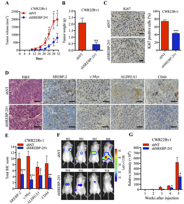 Figure 6: SREBP-2 promotes PCa tumorigenicity and metastasis in vivo. A. CWR22Rv1 shNT and shSREBP-2#1 cells were subcutaneously injected into male nude mice (5 mice for each group). The tumor volumes of xenograft were measured and monitored at indicated time. *P < 0.05. B. The weights of subcutaneous CWR22Rv1 shNT and shSREBP-2#1 tumors 31 days after injection. **P < 0.01. Tumor images were shown in Supplementary Figure S7B. C. Representative images and the percentage of Ki67 positive cells in CWR22Rv1 shNT and shSREBP-2#1 tumor tissues. Scale bar = 20 μm, ***P < 0.001. D. H&E and IHC analysis of SREBP-2, c-Myc, ALDH1A1 and CD44 expression in CWR22Rv1 shNT and shSREBP-2#1 tumor tissues. Scale bar = 20 μm. E. Quantitative analysis of SREBP-2, c-Myc, ALDH1A1 and CD44 was performed and reported as total IHC score by assessing the intensity of each staining and the percentage of positive cells, shown as the mean ± SD from each group. *P < 0.05, **P < 0.01, ***P < 0.001. F. representative BLI images of mice bearing metastatic CWR22Rv1 shNT or shSREBP-2#1 tumors 5 weeks after intracardiac injection. G. normalized BLI signals of metastatic CWR22Rv1 shNT or shSREBP-2#1 tumor development over the course of 5 weeks. Data represent the mean ± SEM (N = 8). *P < 0.05.