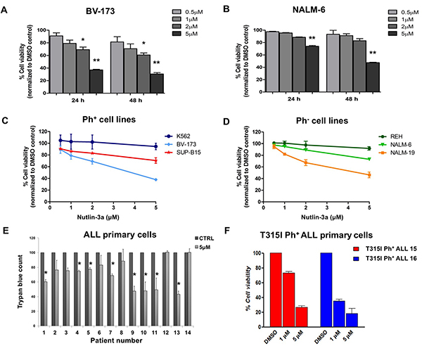 We then analyzed the effect of Nutlin-3a treatment on the viability of primary Ph+ and Ph- ALL cells carrying wild-type p53, by incubating cells with 5 μM Nutlin-3a for 24 hours. Nutlin-3a induced a significant reduction of viability in 5 Ph+ and 3 Ph- ALL primary cells compared to their untreated counterpart (p < 0.05) (Figure 2E). Notably, the dose-dependent reduction in cell viability was confirmed in primary blast cells from two Ph+ ALL patients with the T315I BCR-ABL1 kinase domain mutation, which is responsible for resistance to currently available TKIs (Figure 2F).
