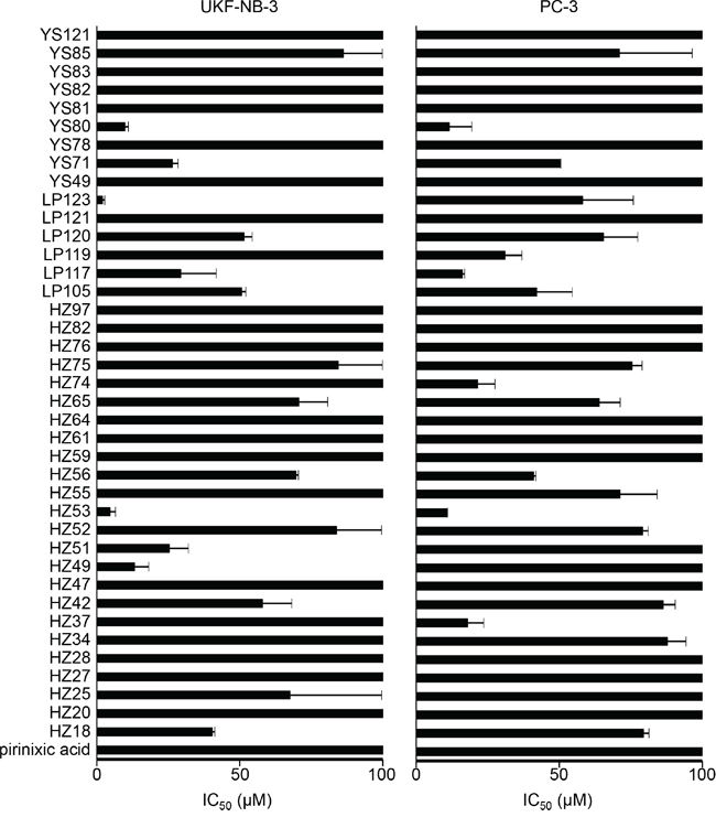 18 compounds including pirinixic acid showed IC50 values >100μM in both cell lines. 11 compounds displayed IC50 values between 10μM and 100μM in UKF-NB-3 and PC-3 cells. Three compounds (HZ25, HZ49, HZ51) showed IC50 values between 10μM and 100μM in UKF-NB-3 cells but IC50s >100μM in PC-3 cells. Five compounds (HZ34, HZ37, HZ55, HZ74, LP119) displayed IC50 values <100μM and >10μM in PC-3 cells but IC50 values >100μM in UKF-NB-3. Three compounds (HZ53, LP123, YS80) had IC50 values <10μM in UKF-NB-3 cells and IC50 values >10μM and <100μM in PC-3 cells. Notably, there was no significant difference between the IC50 value of YS80 in UKF-NB-3 cells (9.87 ± 1.19μM) and in PC-3 cells (11.61 ± 7.83μM) although they were classified into different categories (Figure 1, Suppl. Table 1).