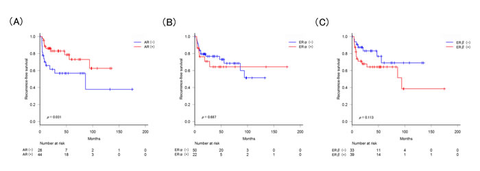 Figure 2: Recurrence-free survival according to the expression of AR/ERα/ERβ in tumors.