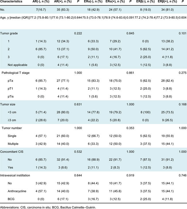 Table 2: Correlations between AR/ERα/ERβ expression in normal urothelial tissues and clinicopathological features of BC
