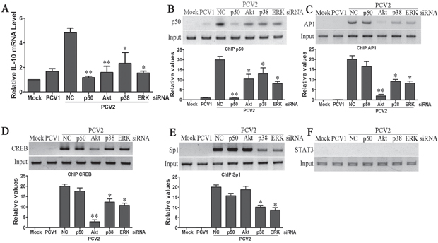 Figure 4: PCV2 activates p38 MAPK and ERK pathways to further enhance IL-10 production in the later phase of infection. PAMs were transfected with the specific siRNAs of NF-κB, Akt, ERK or p38 MAPK, or negative control siRNA for 24 h, then cells were infected with 1 MOI of PCV2 for 12 h. The levels of IL-10 mRNA were detected by Q-PCR A. The binding activities of NF-κB p50 B. Ap1 C. CREB D. Sp1 E. and STAT3 F. were detected through ChIP assay. The relative binding levels of transcriptional factor with il10 promoter were further exactly evaluated by Q-PCR (bottom panel in B, C, D, E). Mock and PCV1 inoculated cells were used as control in these assays. The results are mean ± SEM of 3 independent experiments. *P < 0.05, **P < 0.01 versus negative control (NC) siRNA-transfected cells.
