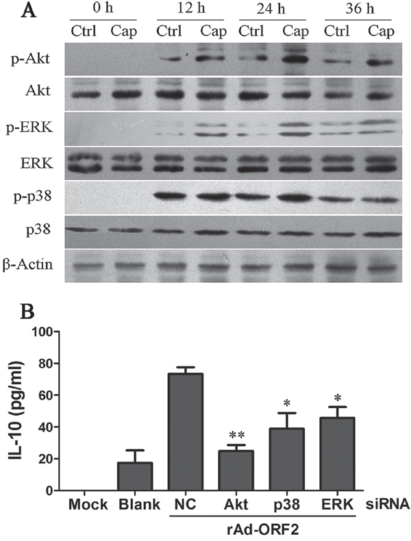 Since PCV2 Cap played a central role in PCV2- induced IL-10 expression, then we further determined whether Cap could also enhance the activation of these signaling pathways activated by PCV2 in recombinant adenoviruses rAd-Cap-infected PAMs. The results showed recombinant adenoviruses could partly activate these signaling pathways themselves. However, compared to empty recombinant adenoviruses (rAd-blank), rAd-ORF2 could significantly up-regulate p-Akt, p-p38 MAPK and p-ERK with no visible change of Akt, p38 MAPK and ERK (Figure 6A). Except that, there were no significant differences in IκB and JNK phosphorylation between rAd-blank and rAd-ORF2 (data no shown). Specific siRNAs were also employed to determine the roles of these signaling pathways in the expression of IL-10 induced by rAd-ORF2. Down-regulation of Akt, p38 MAPK, and ERK did inhibit rAd-ORF2-induced IL-10 production (Figure 6B). These results suggested that PCV2 Cap protein could up-regulate IL-10 expression though PI3K/Akt, p38 MAPK and ERK signaling pathways.