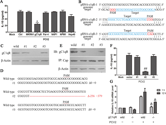 Figure 7: PCV2 Cap binds with gC1QR protein to promote IL-10 production. A. The specific siRNAs of gC1QR, MKRN1, Par-4, NAP1, NPM1 and HSP40 were transfected into PAMs, then PCV2 infected the cells (1×106 cells) for 24 h. The secretion of IL-10 in different siRNAs-transfected cells were measured by ELISA. B. Graphical representation of targeted porcine gC1QR loci. Targeted genomic loci are indicated in blue. Protospacer adjacent motifs (PAM) sequences are marked in red. C. Western blotting analysis of gC1QR proteins after CRISPR-Cas9 system targeting gC1QR locus infected PAMs. #1, #2 and #3 indicated the cells infected with lentiviruses containing gRNA-c1qR-1, gRNA-c1qR-2 and gRNA-c1qR-3, respectively. D. Sanger sequencing of genomic PCR products encompassing the genomic-editing site from cells #1, #2 and #3. The WT reference sequence is shown on the top. The bottom is targeted sequence with both deletions and insertions. The sizes of insertion (+), deletion (Δ) are presented on the right of each allele. Red dashes: deleted and insertion bases; E. Immunoprecipitation analysis of the interaction of Cap with gC1QR after CRISPR-Cas9 system targeting gC1QR locus in PAMs. F. The IL-10 secretion were measured in wild-type and #1, #2 and #3 cells 24 h after PCV2 inoculation. G. The IL-10 mRNA levels were measured in wild-type and gC1QR-/- cells (#2) 1h and 24 h after PCV2 inoculation. The results are mean ± SEM of 3 independent experiments. *P < 0.05 versus control siRNA-transfected cells (Ctrl).##P < 0.01 versus the cells infected with control lentiviruses without gRNA (vector). &P < 0.05 versus wild-type cells (wild) at same time.